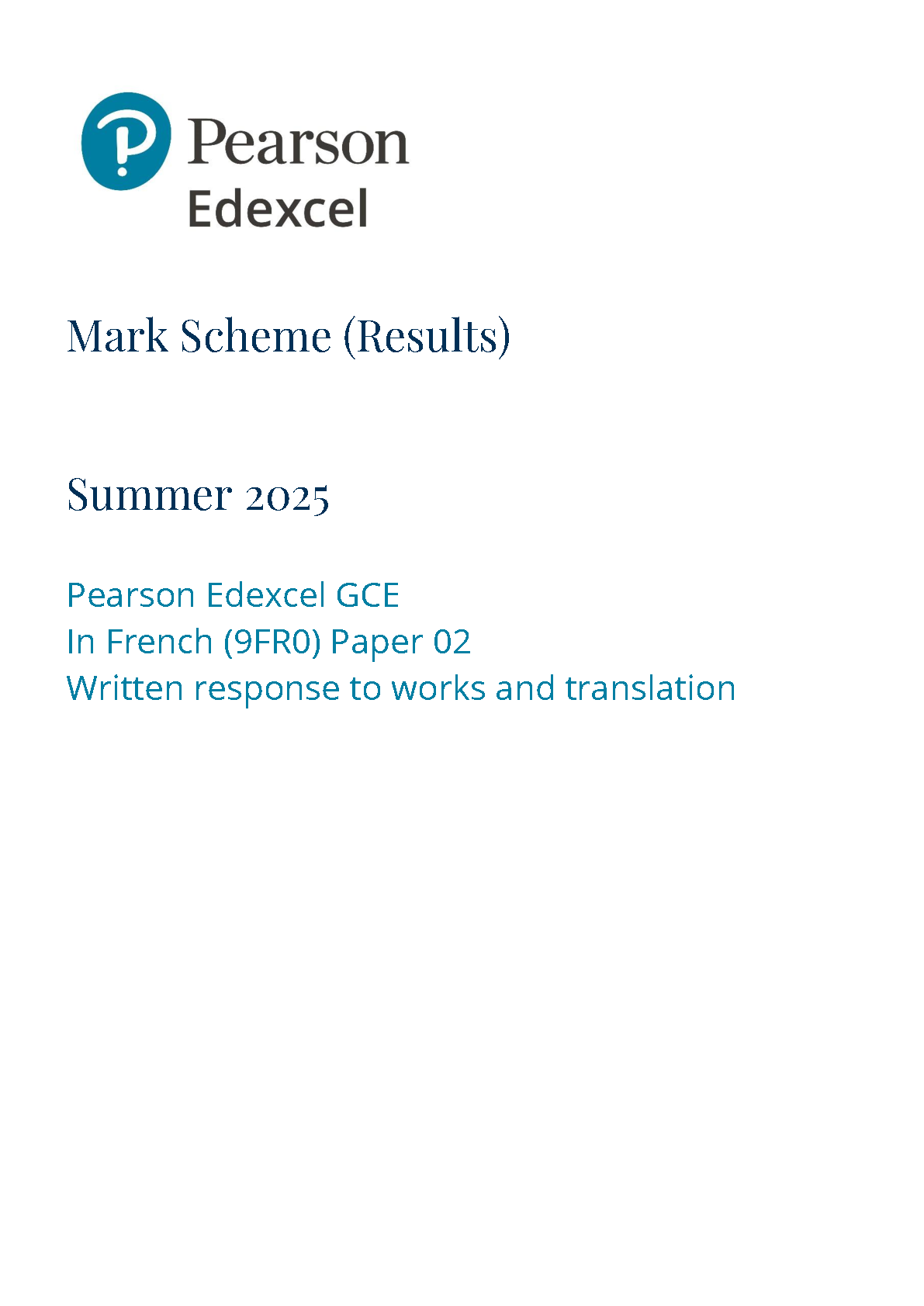 2025 Pearson Edexcel A Level French Mark Scheme Paper 2 (9FR0/02: Written response to works and translation)