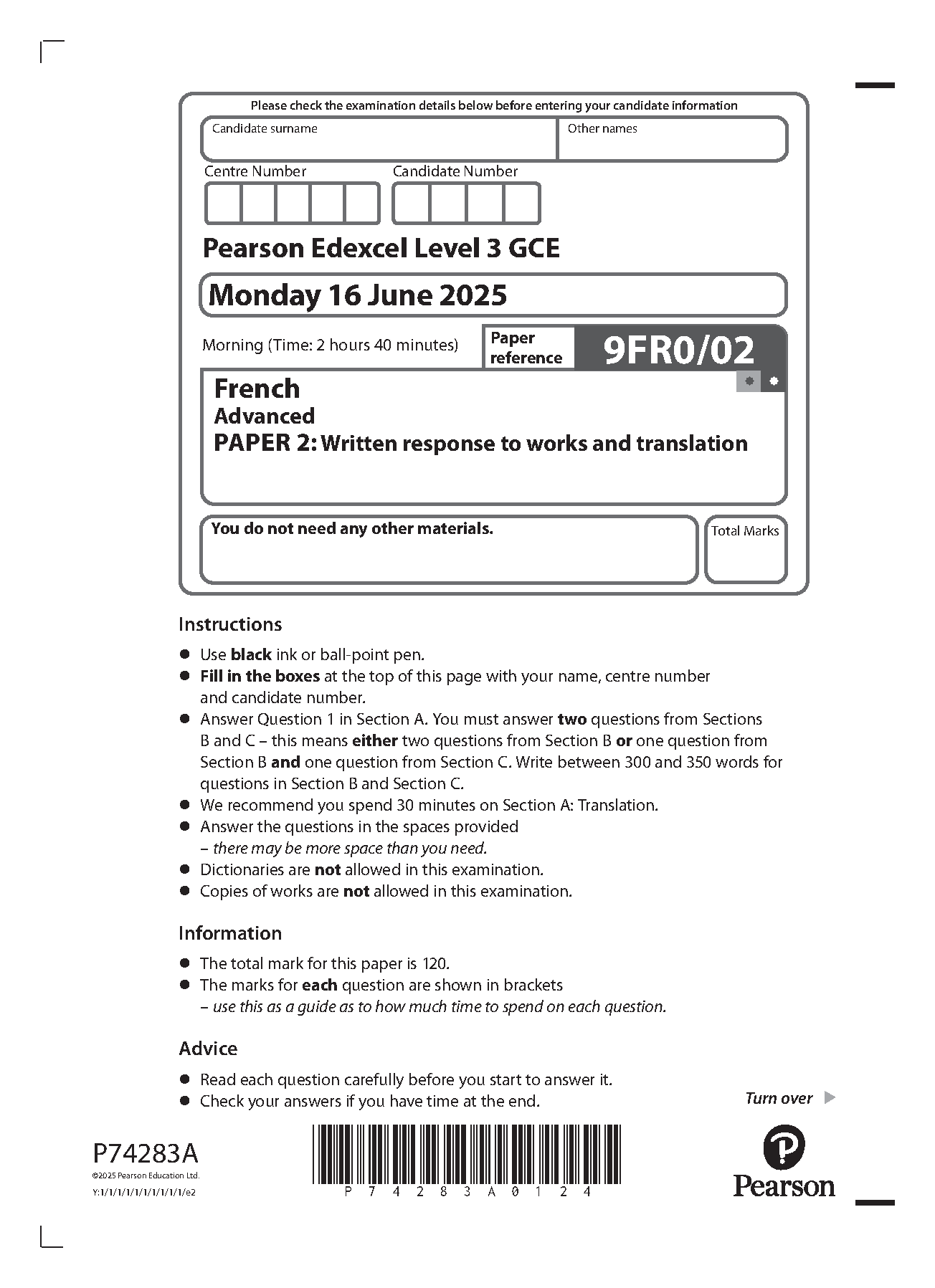 2025 Pearson Edexcel A Level French Paper 2 (9FR0/02: Written response to works and translation)