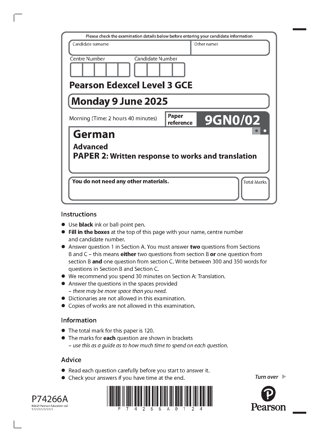 2025 Pearson Edexcel A Level German Paper 2 (9GN0/02: Written Response to Works and Translation)