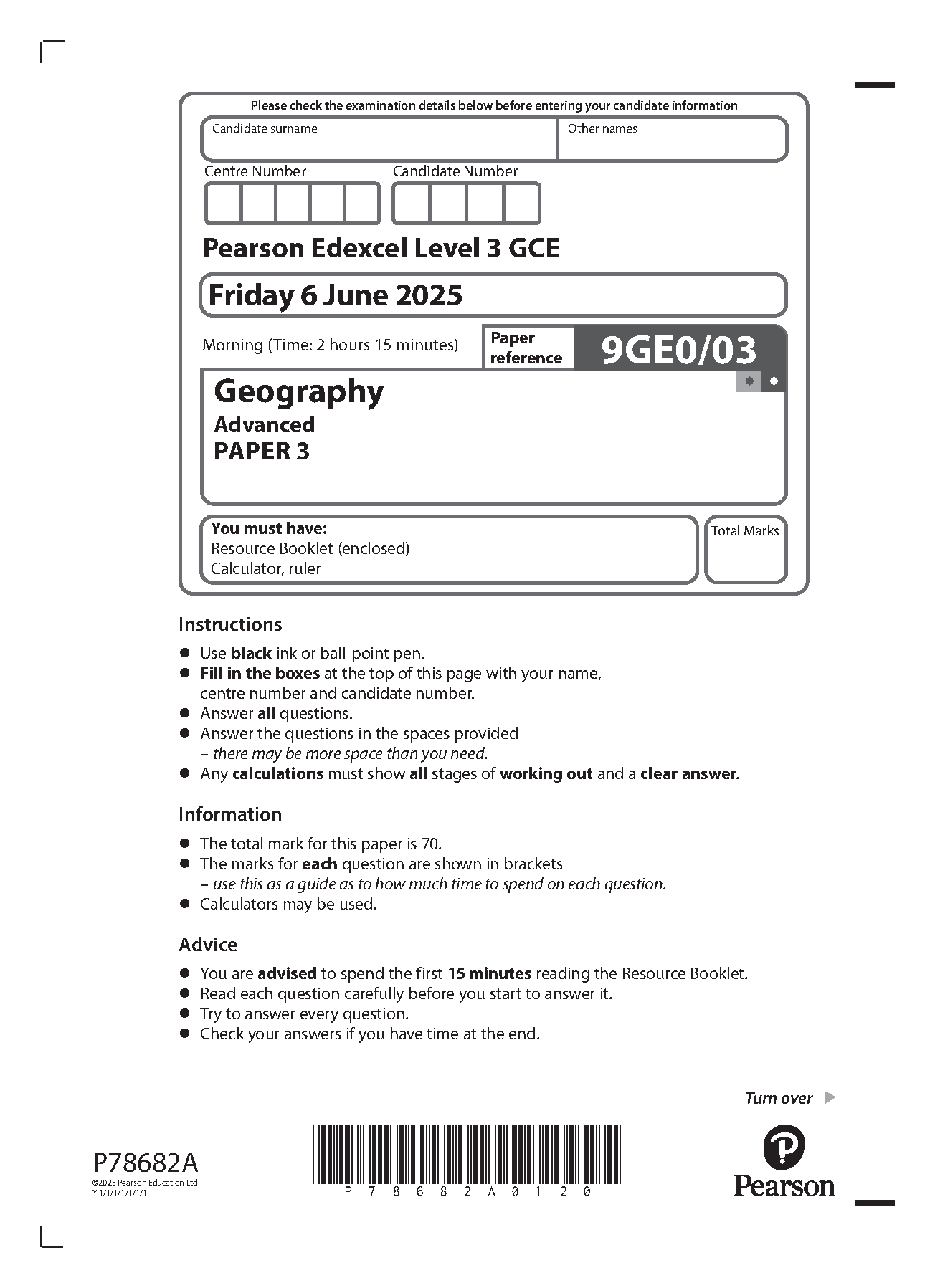 2025 Pearson Edexcel A Level Geography Mark Scheme Paper 3 (9GE0/03)