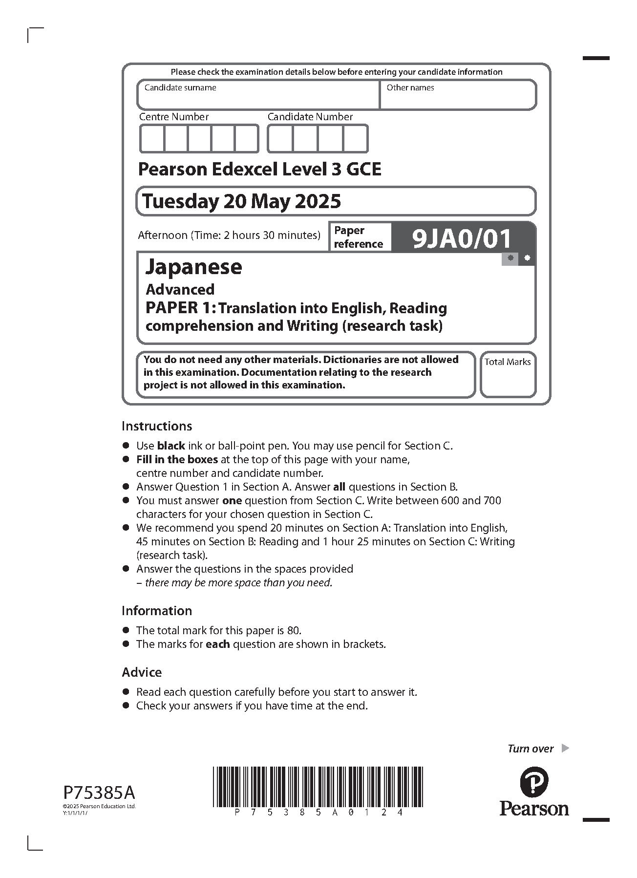 2025 Pearson Edexcel A Level Japanese Paper 1 (9JA0/01)