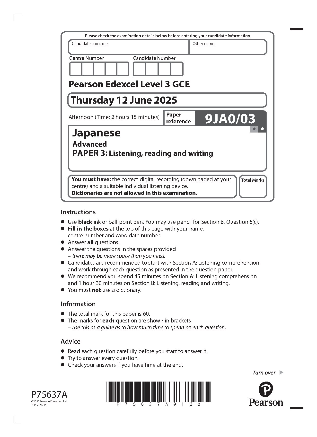 2025 Pearson Edexcel A Level Japanese Paper 3 (9JA0/03: Listening, reading and writing)