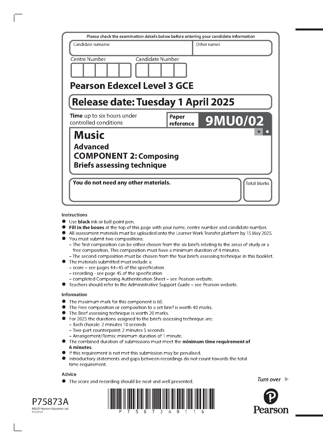 2025 Pearson Edexcel A Level Music component 2 (9MU0/02: Composing Briefs assessing technique)