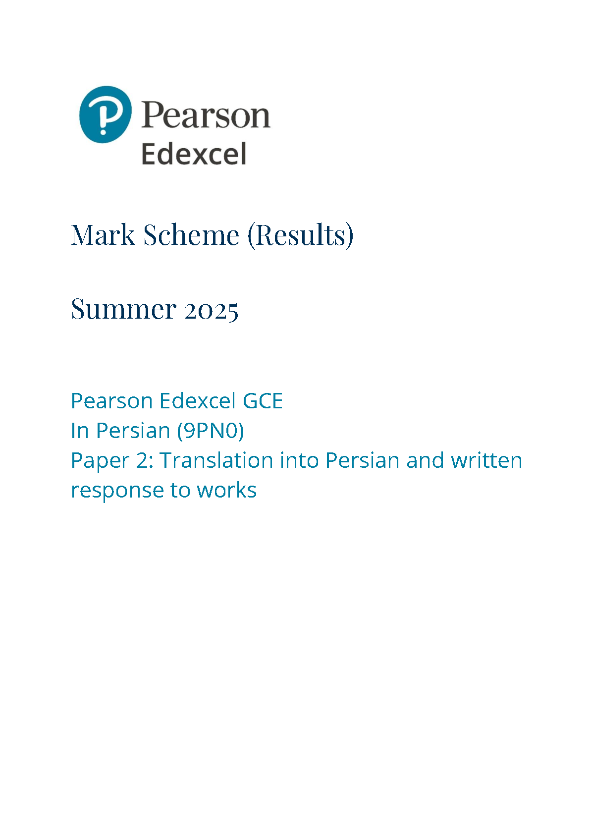 2025 Pearson Edexcel A Level Persian Mark Scheme Paper 2 (9PN0/02: Translation into Persian and written response to works)