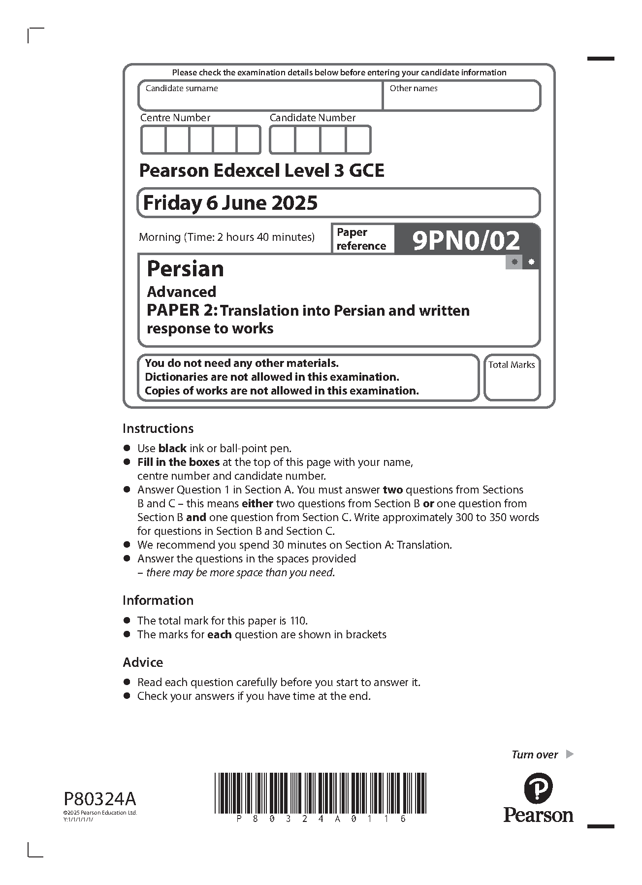 2025 Pearson Edexcel A Level Persian Paper 2 (9PN0/02: Translation into Persian and written response to works)