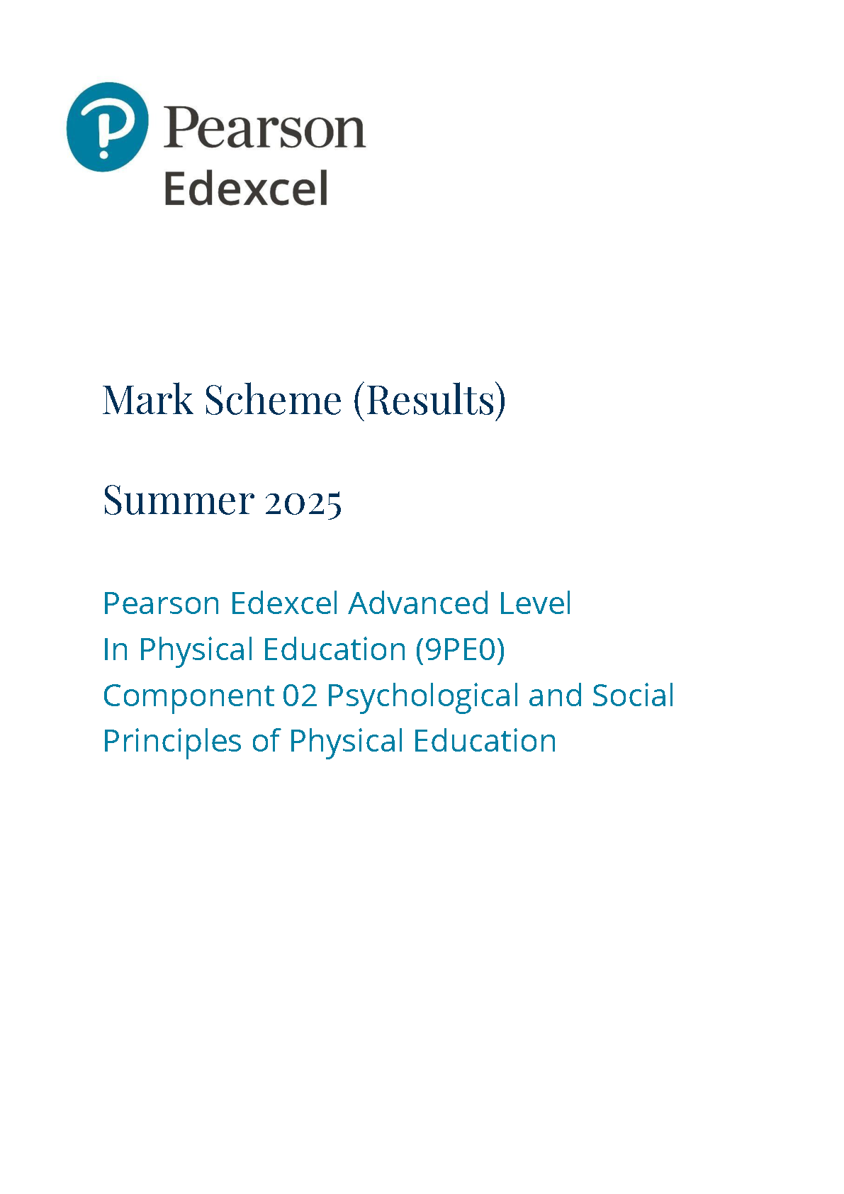 2025 Pearson Edexcel A Level Physical Education Mark Scheme Paper 2 (9PE0/02: Psychological and Social Principles of Physical Education)