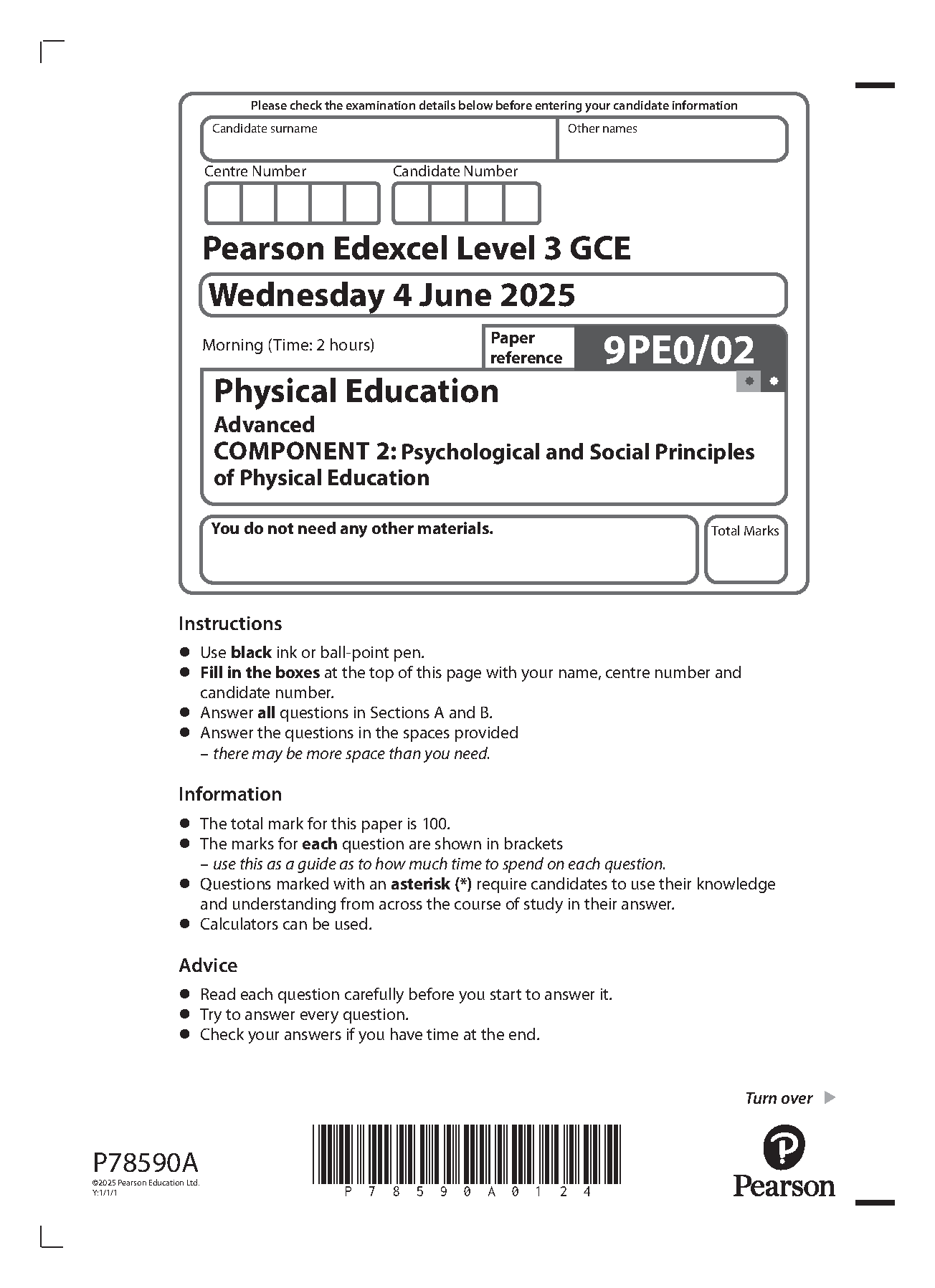 2025 Pearson Edexcel A Level Physical Education Paper 2 (9PE0/02: Psychological and Social Principles of Physical Education)