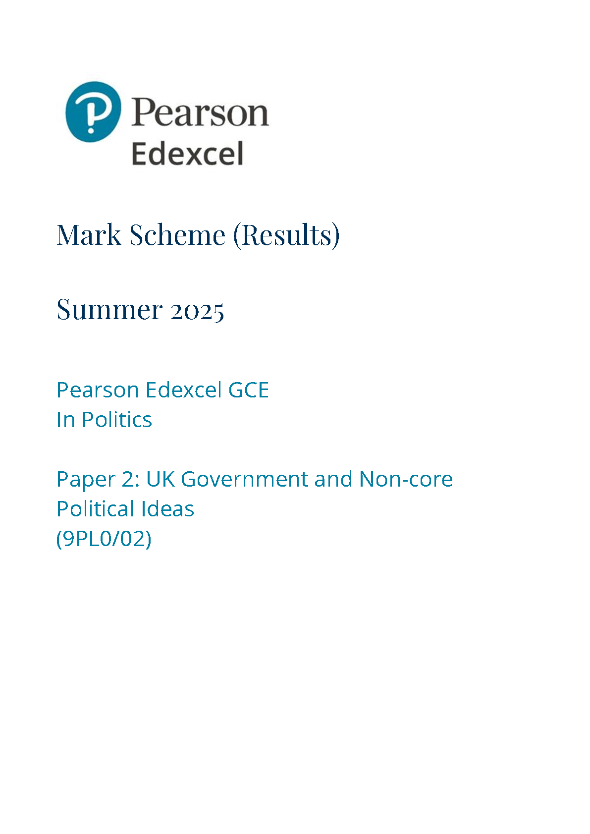 2025 Pearson Edexcel A Level Politics Mark Scheme Paper 2 (9PL0/02: UK Politics and Non-core Political Ideas)