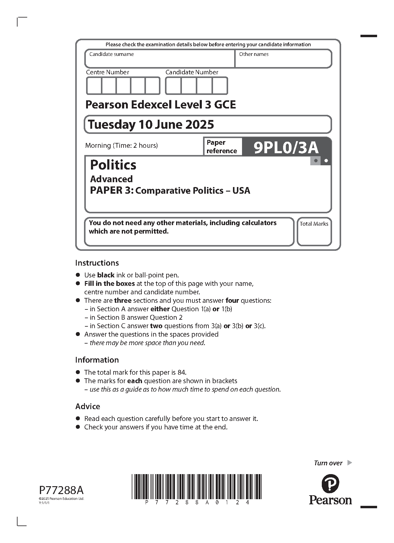 2025 Pearson Edexcel A Level Politics Paper 3 (9PL0/3A: Comparative Politics – USA)