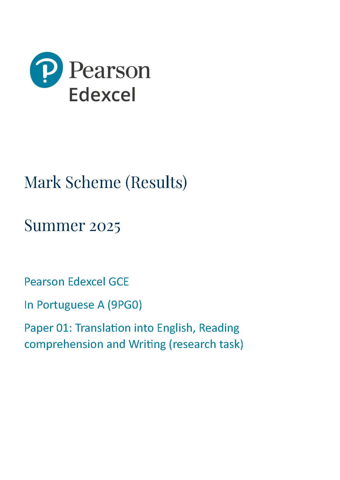 2025 Pearson Edexcel A Level Portuguese Mark Scheme Paper 1 (9PG0/01: Translation into English, Reading comprehension and Writing (research task))