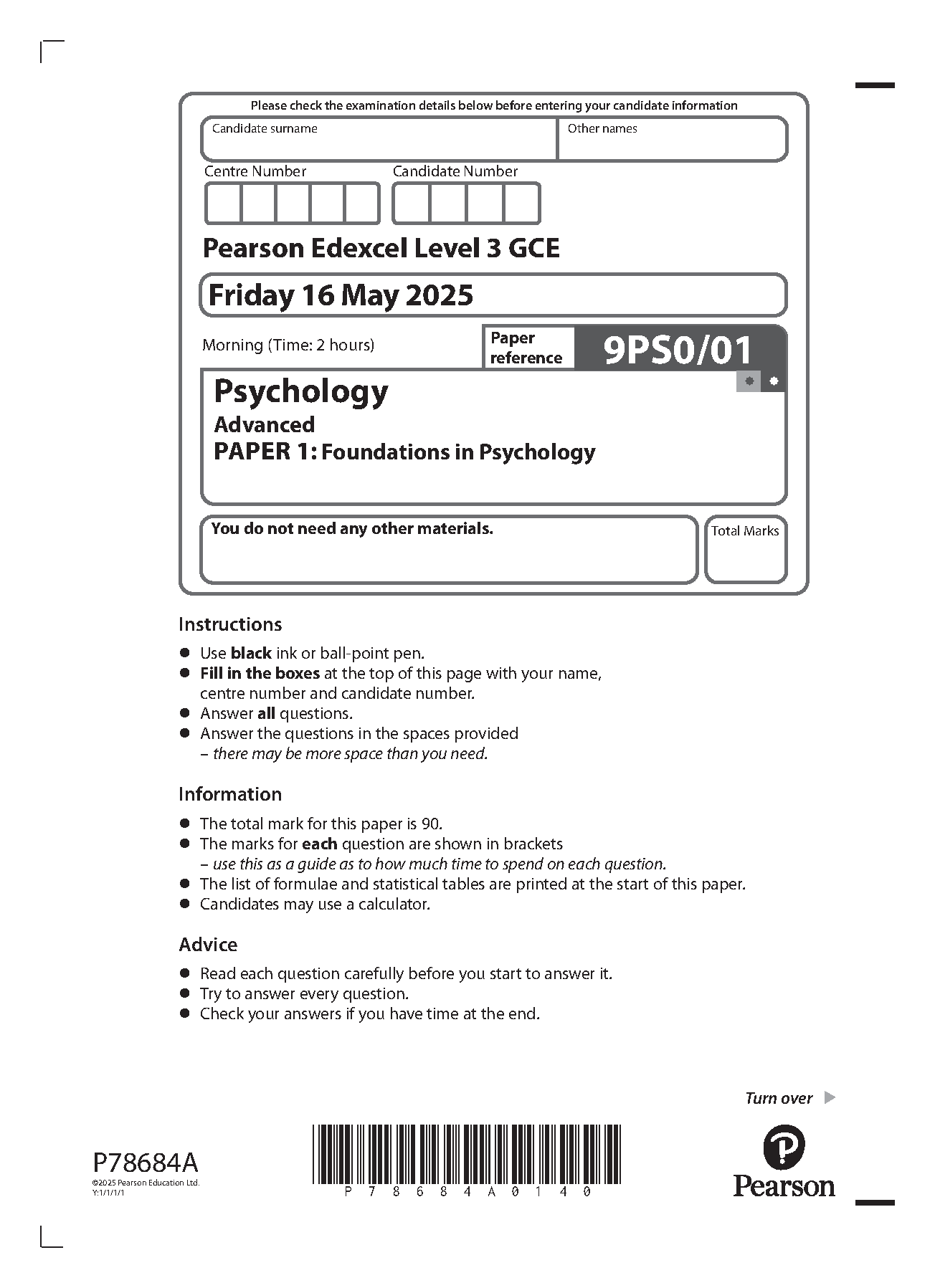 2025 Pearson Edexcel A Level Psychology Paper 1 (9PS0/01: Foundations in Psychology)