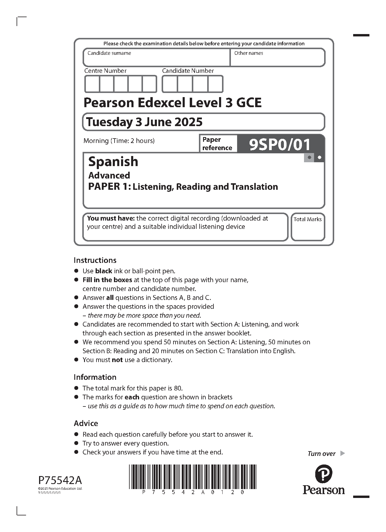 2025 Pearson Edexcel A Level Spanish Paper 1 (9SP0/01: Listening, Reading and Translation)