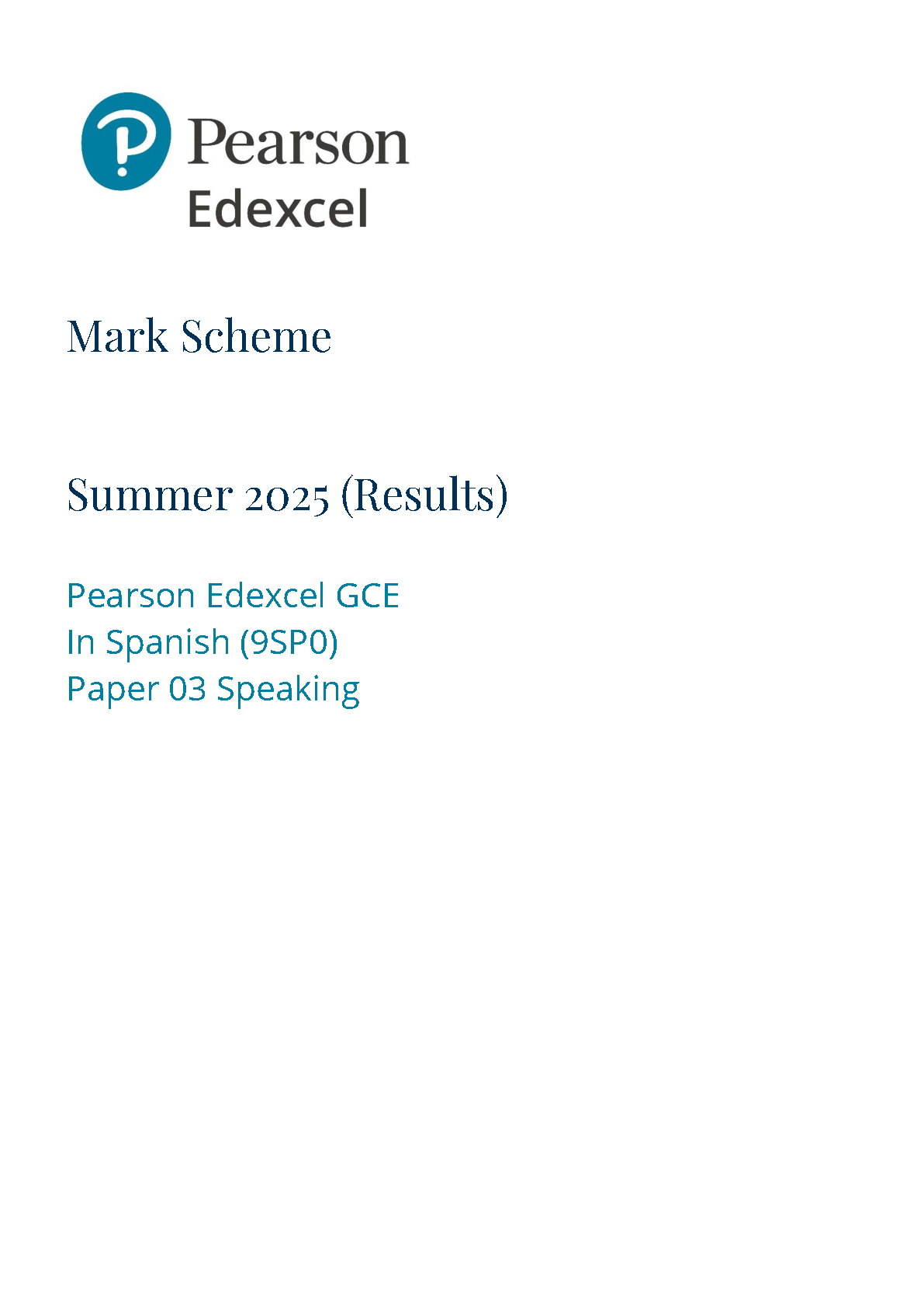2025 Pearson Edexcel A Level Spanish Mark Scheme Paper 3 (9SP0/03: Speaking)