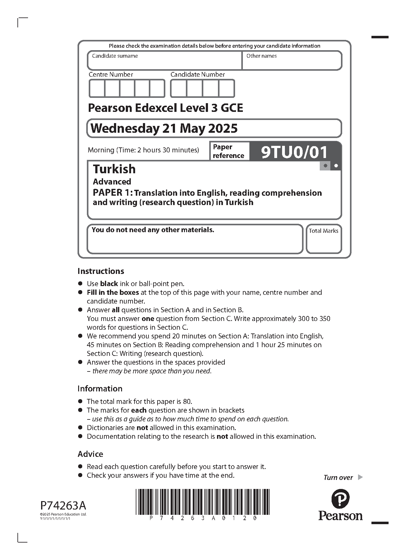 2025 Pearson Edexcel A Level Turkish Paper 1 (9TU0/01: Translation into English, reading comprehension and writing (research question) in Turkish)