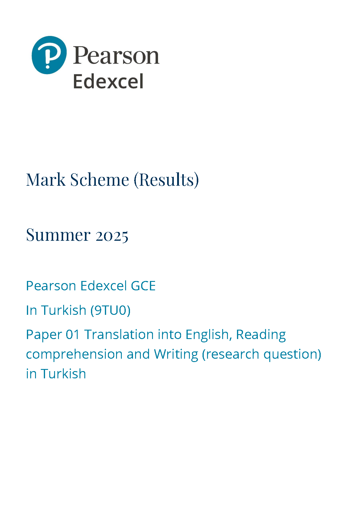 2025 Pearson Edexcel A Level Turkish Mark Scheme Paper 1 (9TU0/01: Translation into English, reading comprehension and writing (research question) in Turkish)