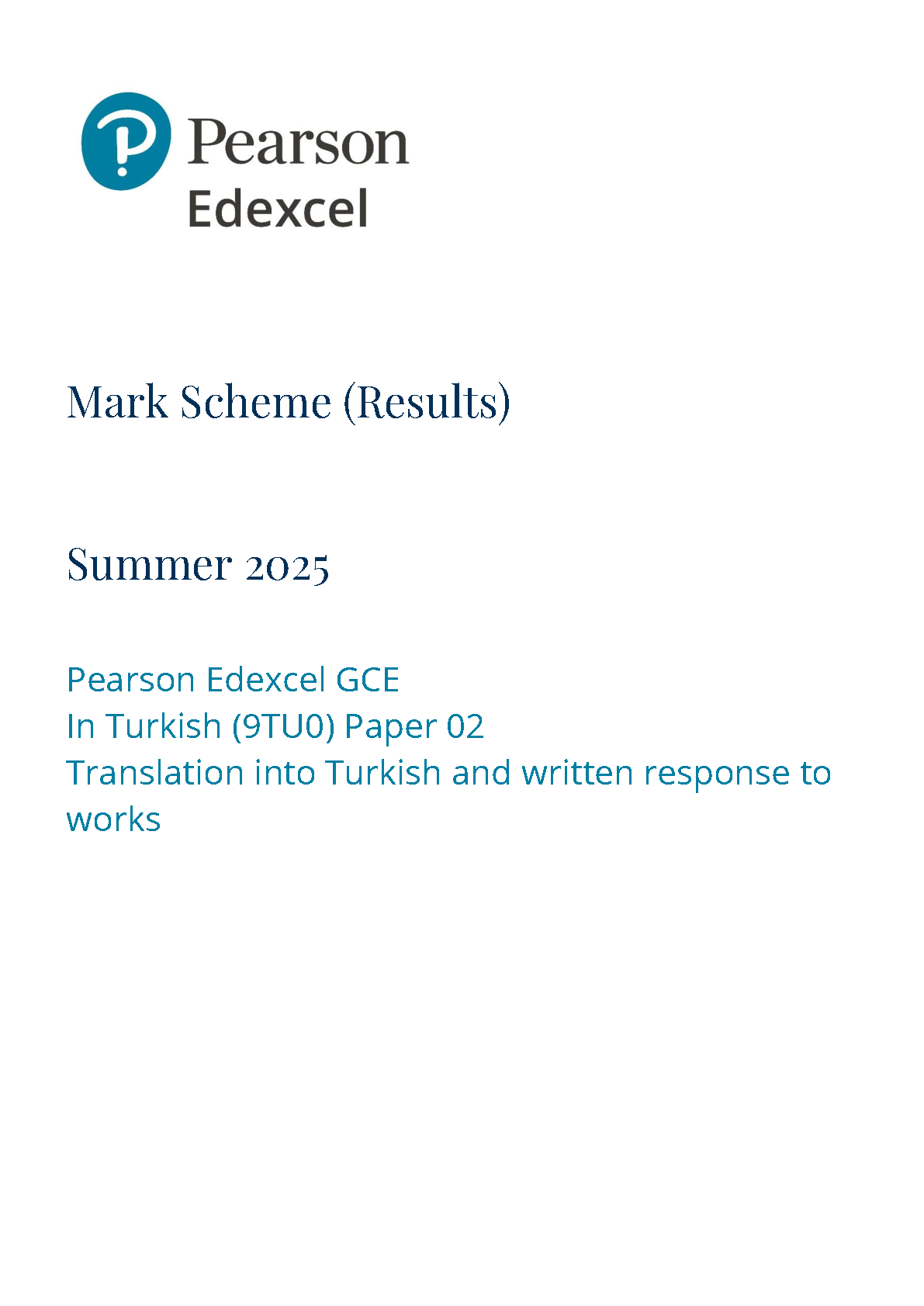 2025 Pearson Edexcel A Level Turkish Mark Scheme Paper 2 (9TU0/02: Translation into Turkish and written response to works)