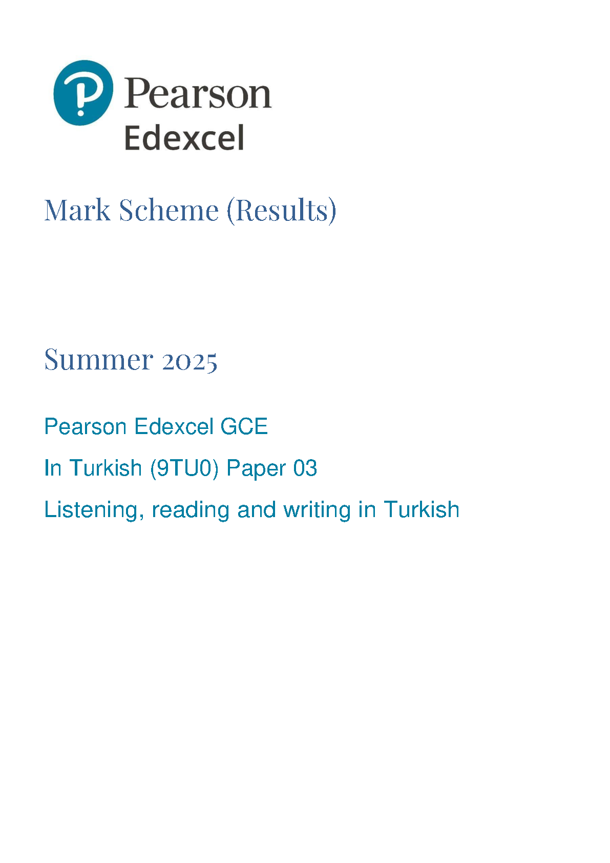 2025 Pearson Edexcel A Level Turkish Mark Scheme Paper 3 (9TU0/03: Listening, reading and writing in Turkish)