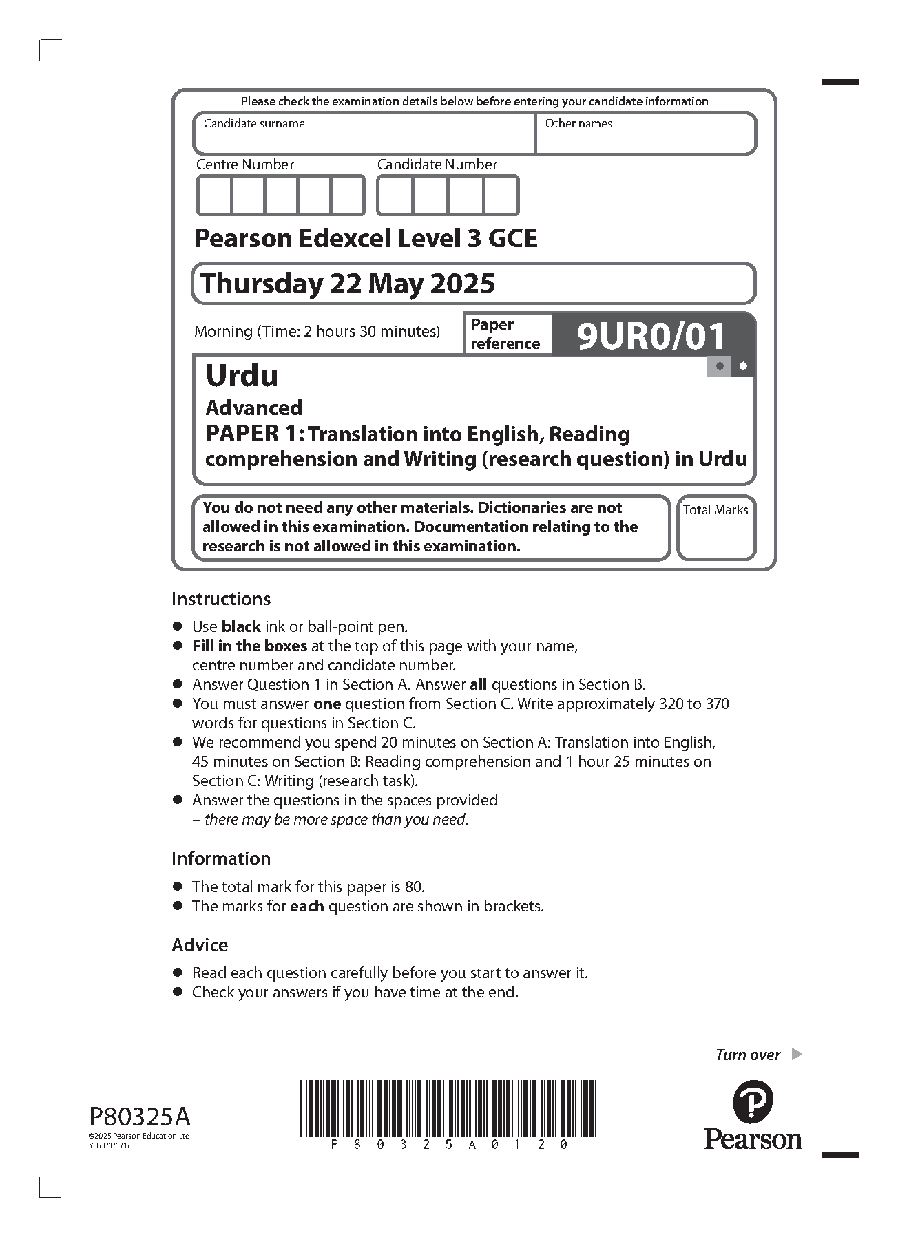 2025 Pearson Edexcel A Level Urdu Paper 1 (9UR0/01: Translation into English, Reading comprehension and Writing (research question) in Urdu)