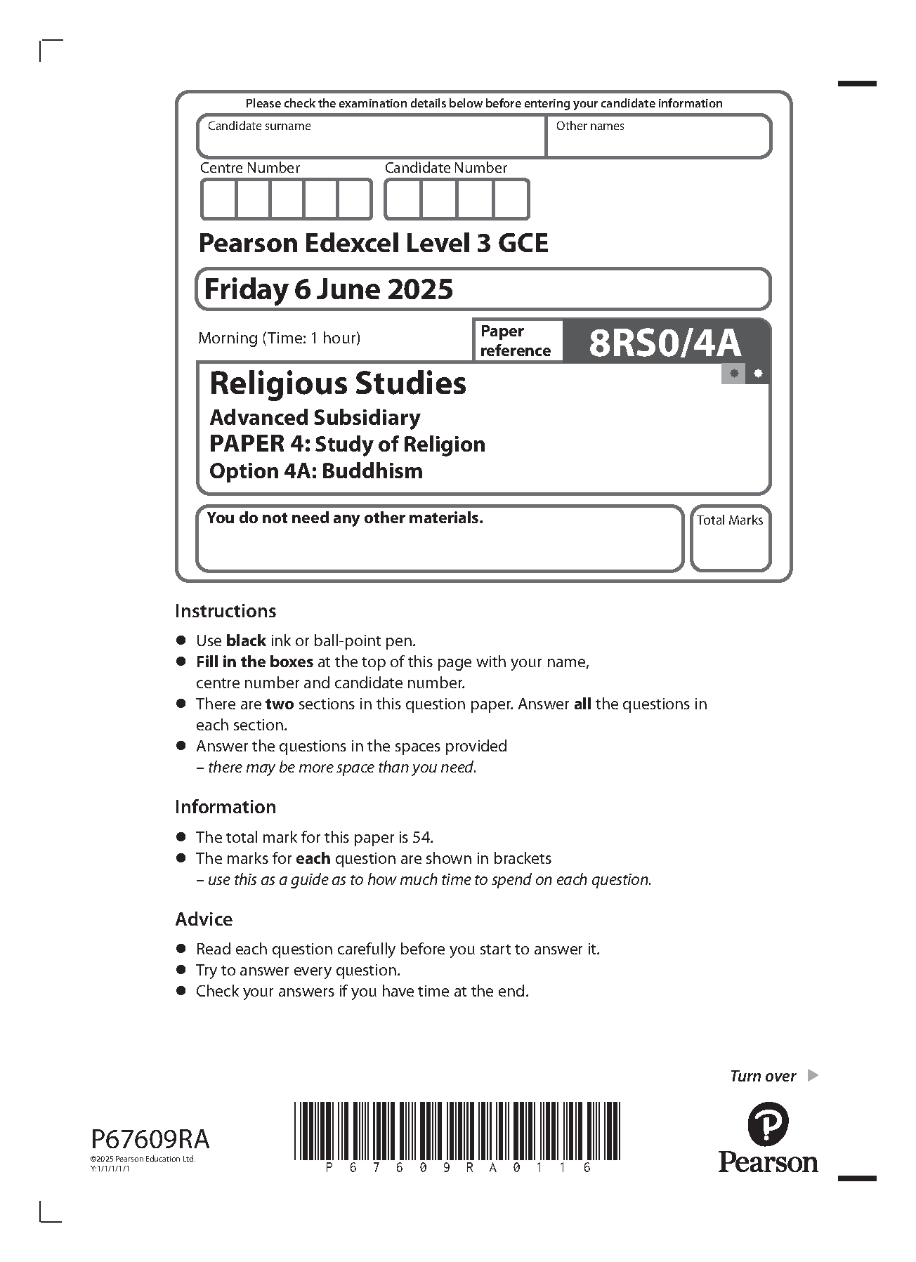 2025 Pearson Edexcel AS Level Religious Studies Paper 4A (8RS0/4A: Study of Religion)