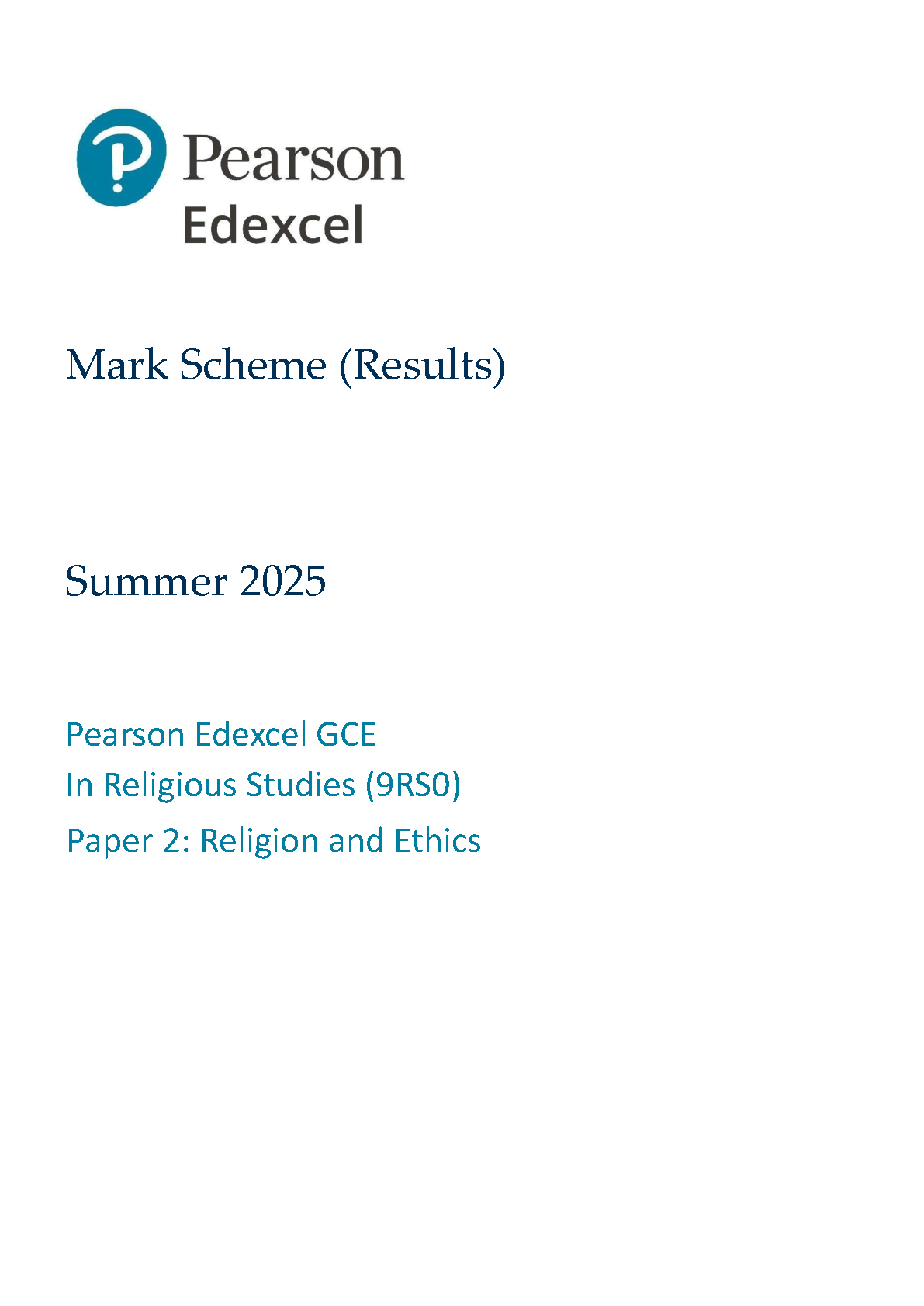 2025 Pearson Edexcel A Level Religious Studies Mark Scheme Paper 2 (9RS0/02: Religion and Ethics)