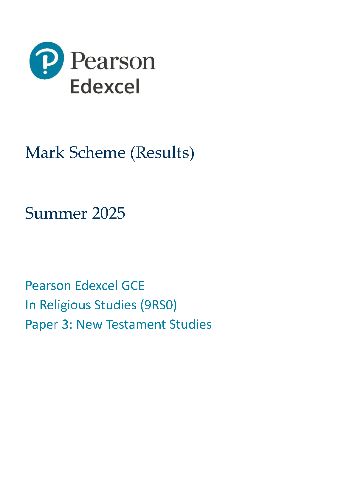 2025 Pearson Edexcel A Level Religious Studies Mark Scheme Paper 3 (9RS0/03: New Testament Studies)
