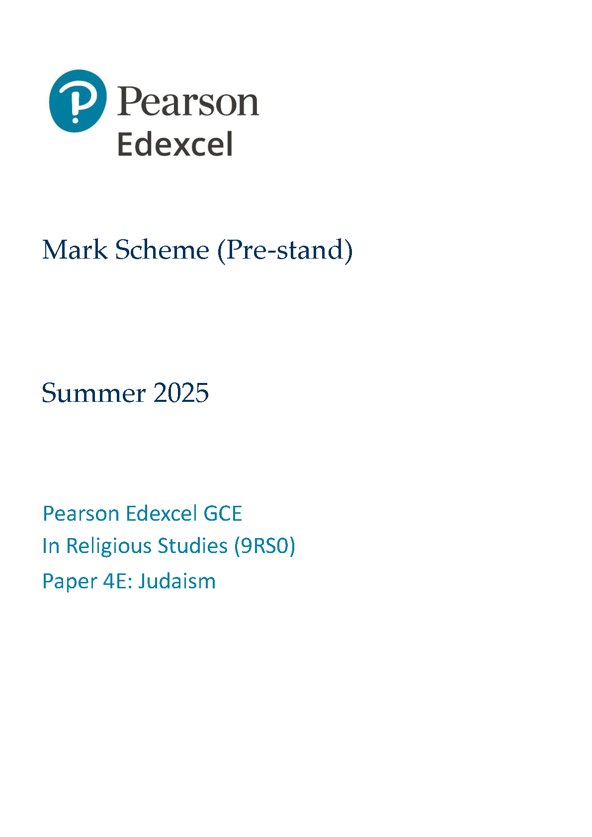 2025 Pearson Edexcel A Level Religious Studies Mark Scheme Paper 4 (9RS0/4E: Judaism)