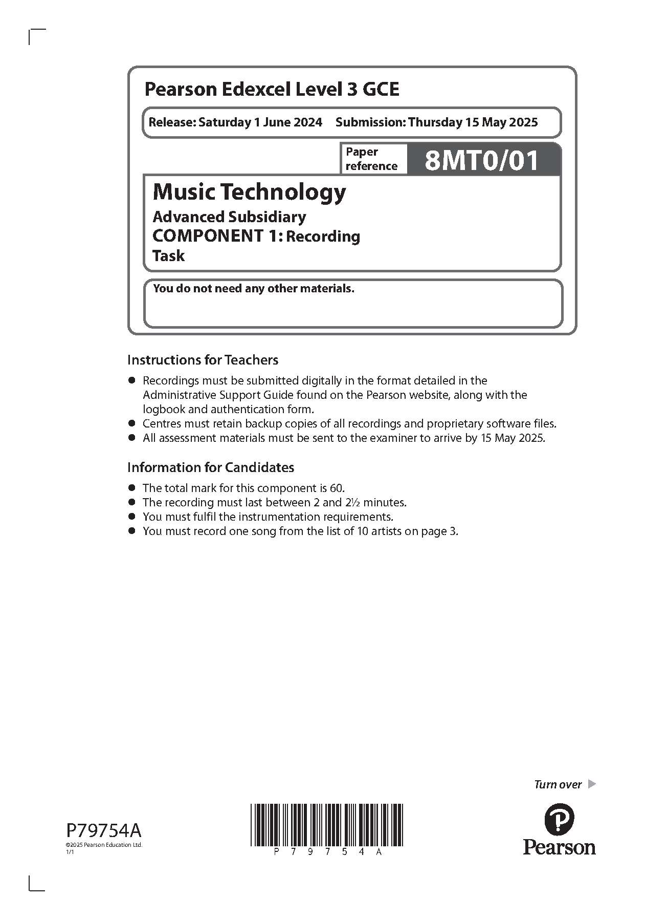 2025 Pearson Edexcel AS Level Music Technology COMPONENT 1 (8MT0/01: Recording Task)