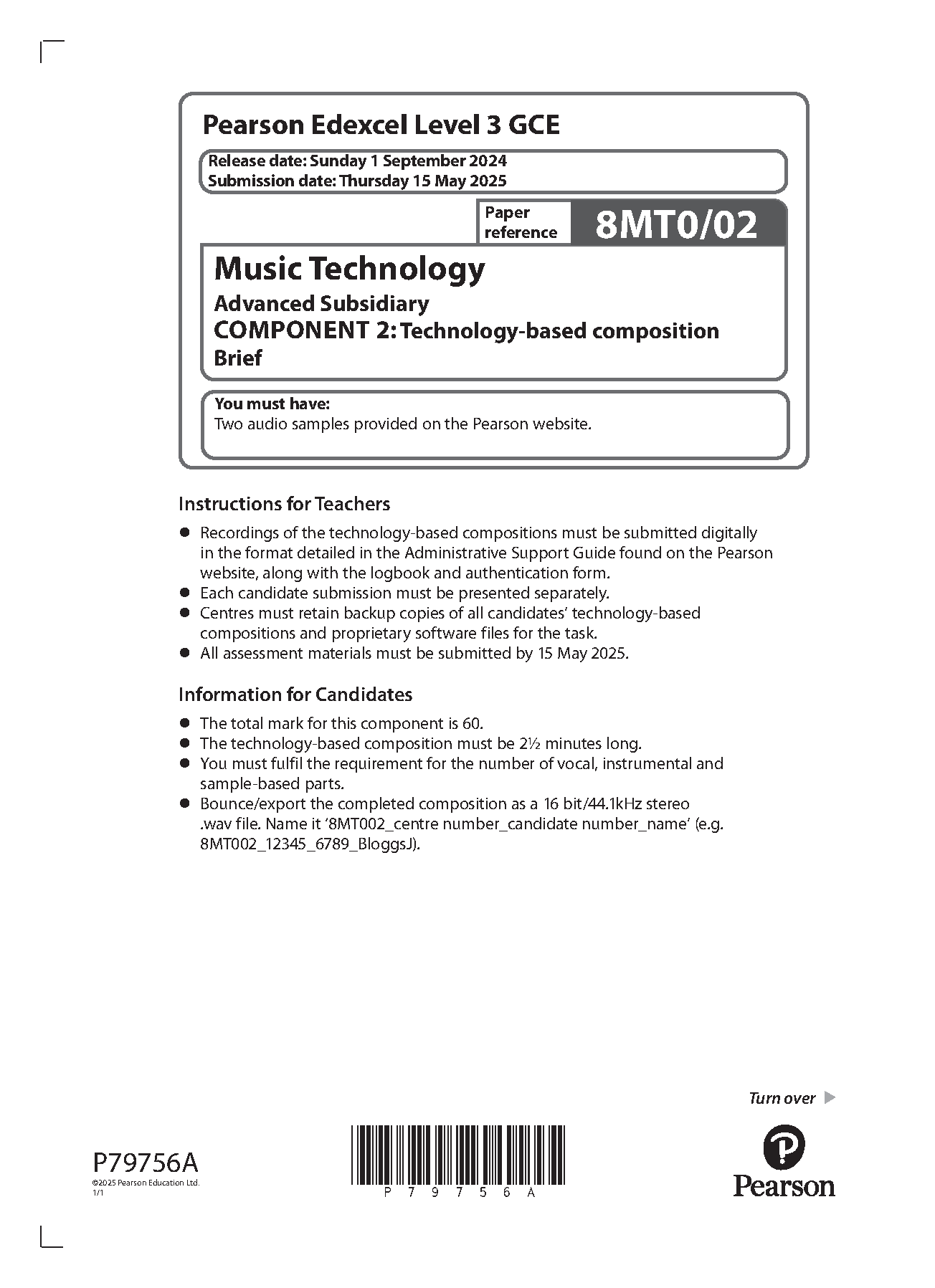 2025 Pearson Edexcel AS Level Music Technology COMPONENT 2 (8MT0/02: Technology-based composition Brief)