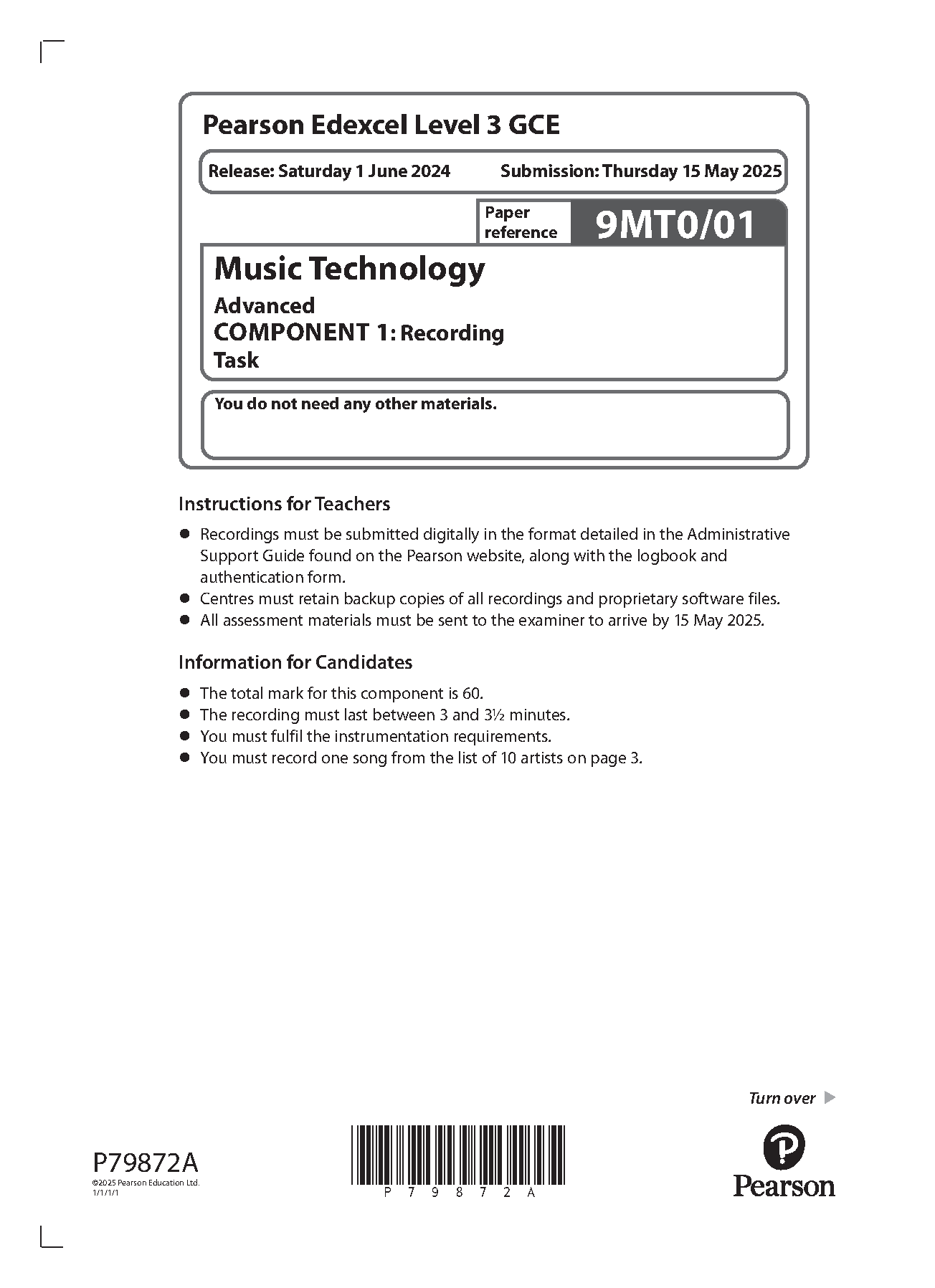 2025 Pearson Edexcel A Level Music Technology COMPONENT 1 (9MT0/01: Recording Task)