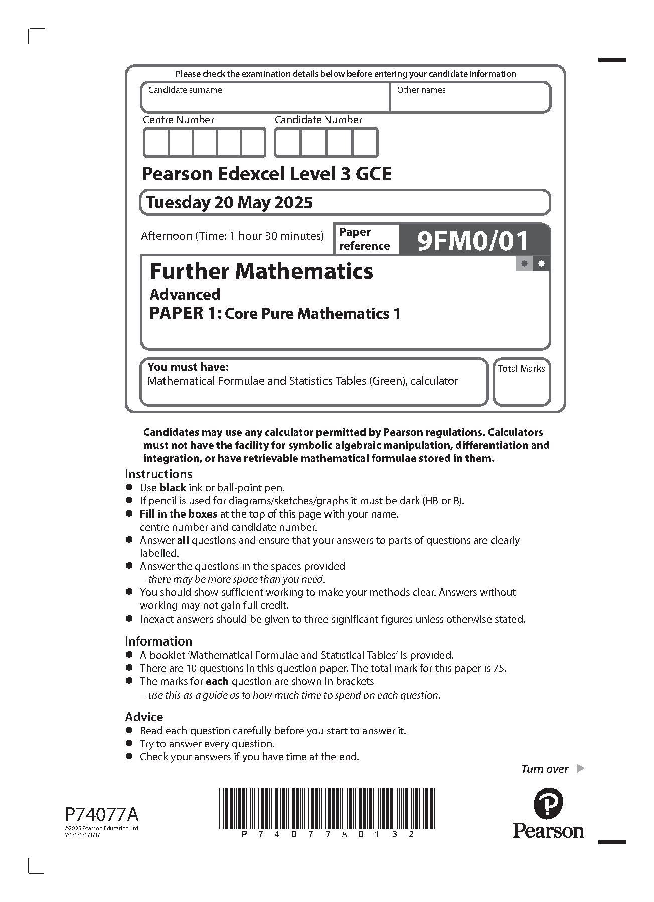 2025 Pearson Edexcel A Level Further Mathematics Paper 1 (9FM0/01: Core Pure Mathematics 1)