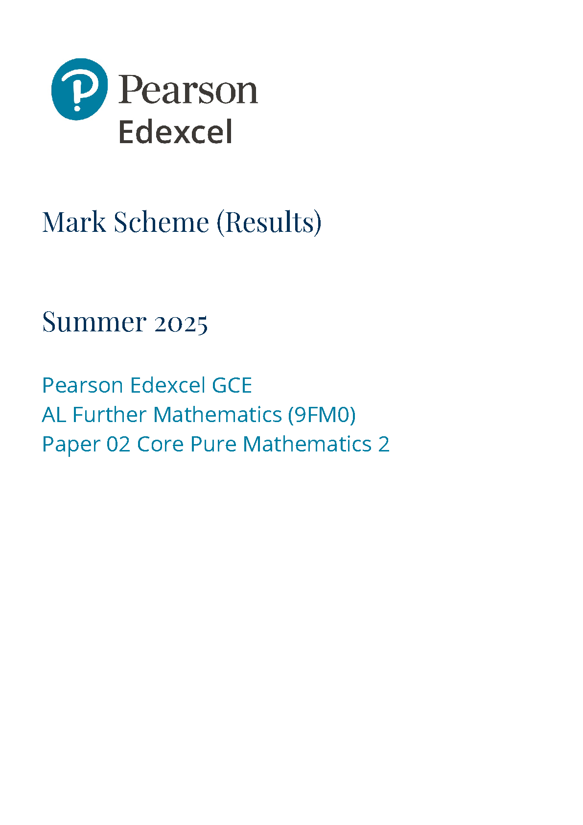 2025 Pearson Edexcel A Level Further Mathematics Mark Scheme Paper 2 (9FM0/02: Core Pure Mathematics 2)