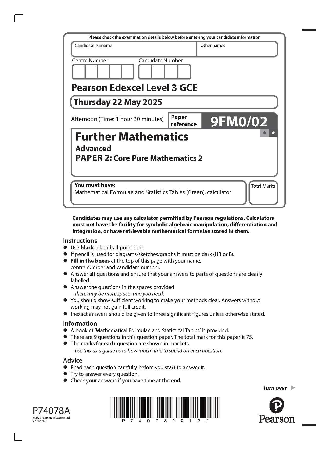 2025 Pearson Edexcel A Level Further Mathematics Paper 2 (9FM0/02: Core Pure Mathematics 2)