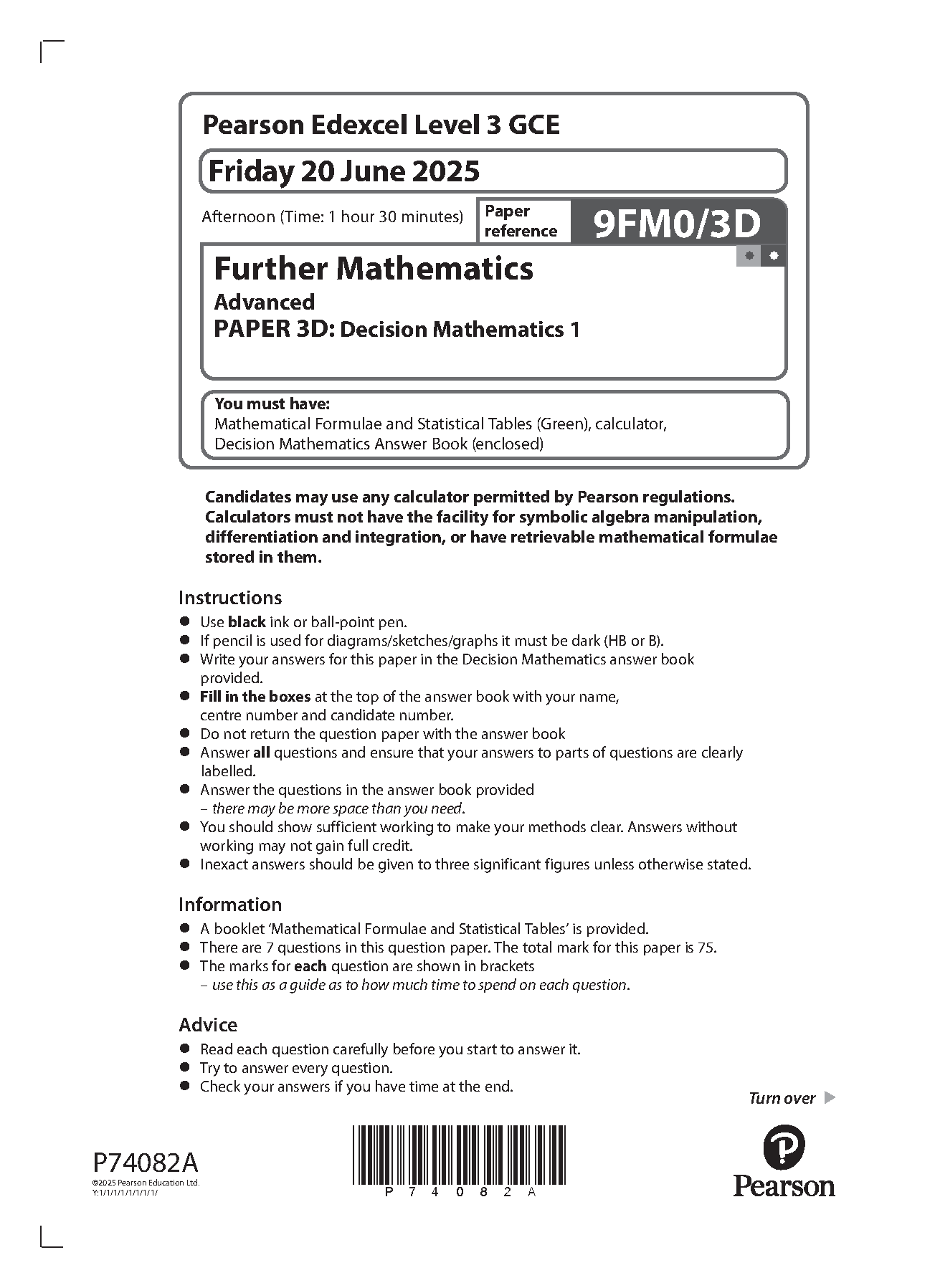 2025 Pearson Edexcel A Level Further Mathematics Paper 3D (9FM0/3D: Further Decision 1)