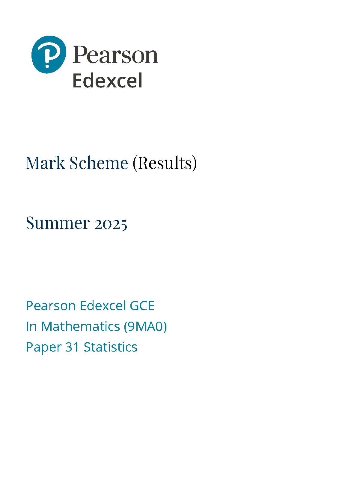 2025 Pearson Edexcel A Level Mathematics Mark Scheme Paper 31 (9MA0/31: Statistics)