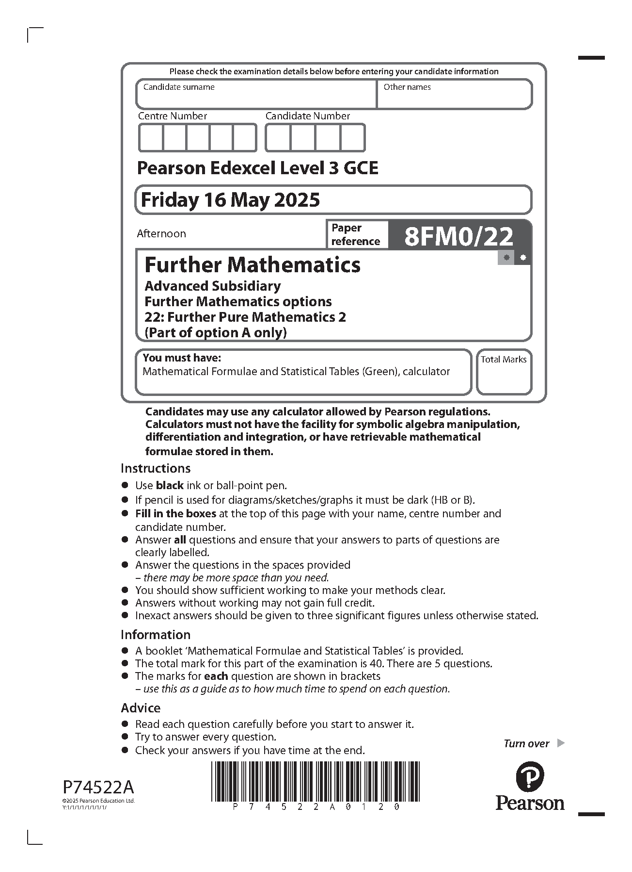 2025 Pearson Edexcel AS Level Further Mathematics Paper 22 (8FM0/22: Further Pure Mathematics 2)