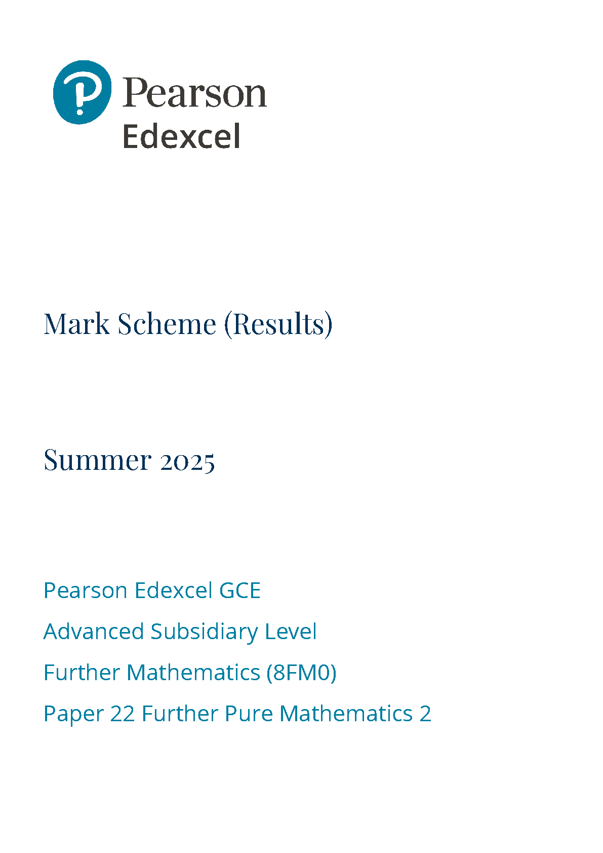 2025 Pearson Edexcel AS Level Further Mathematics Mark Scheme Paper 22 (8FM0/22: Further Pure Mathematics 2)