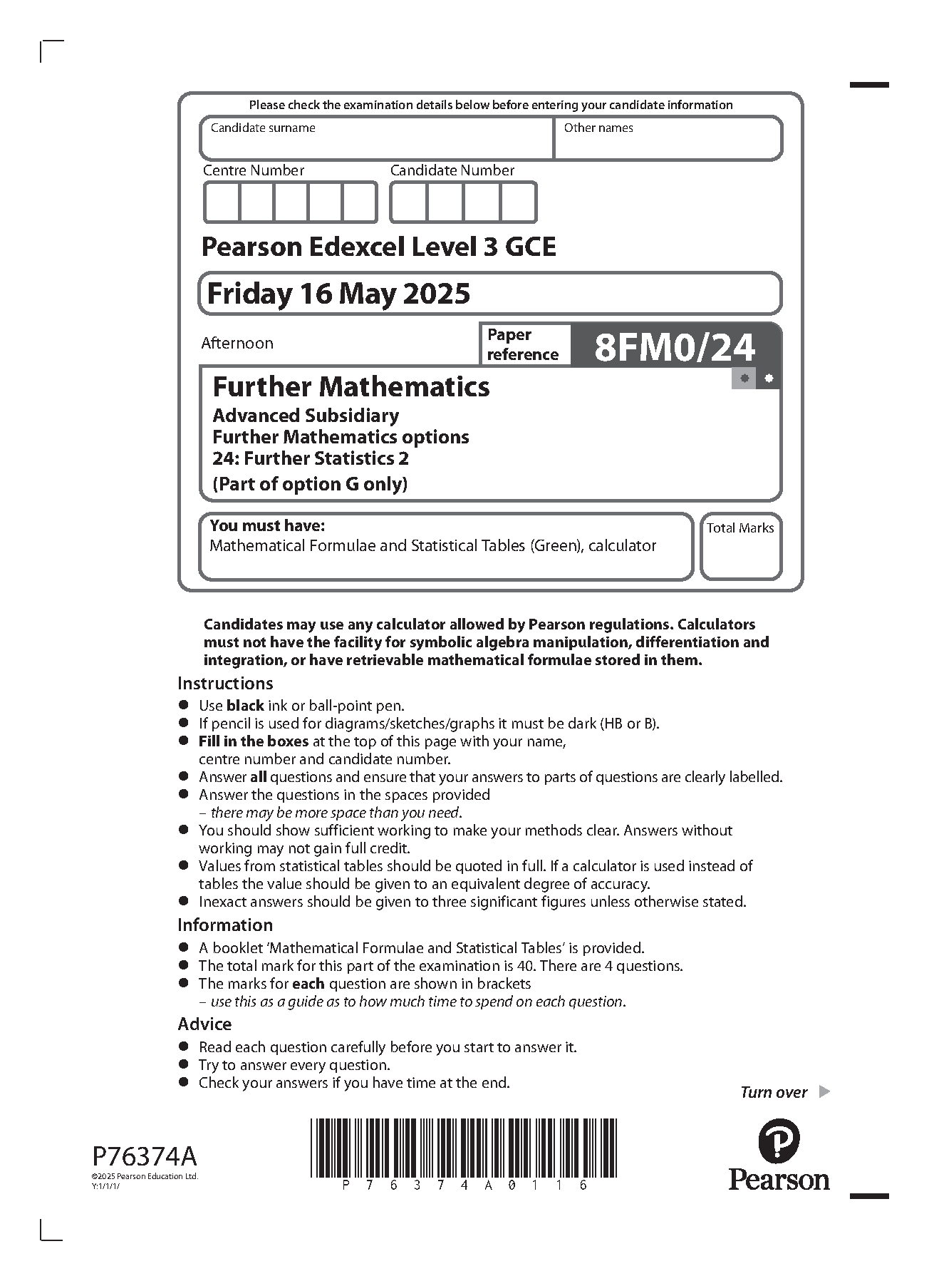 2025 Pearson Edexcel AS Level Further Mathematics Paper 24 (8FM0/24: Further Statistics 2)