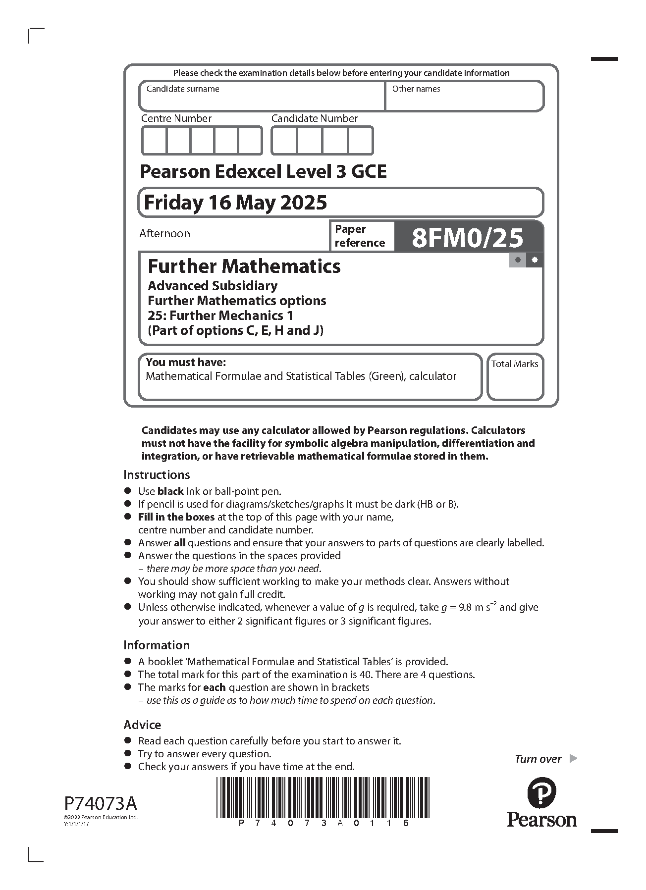 2025 Pearson Edexcel AS Level Further Mathematics Paper 25 (8FM0/25: Further Mechanics 1)