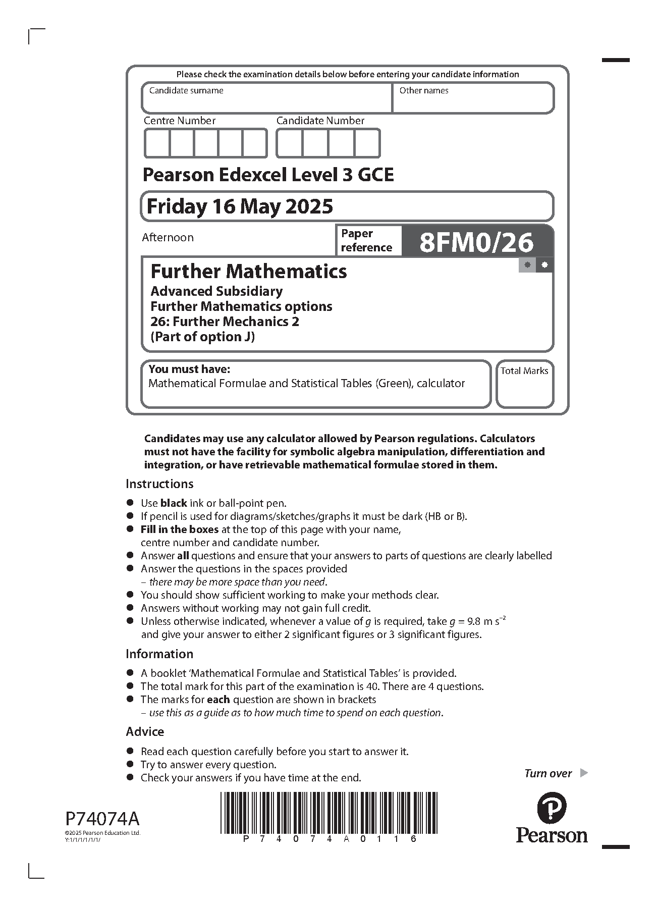 2025 Pearson Edexcel AS Level Further Mathematics Paper 26 (8FM0/26: Further Mechanics 2)