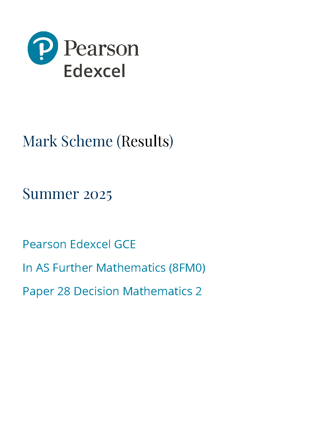 2025 Pearson Edexcel AS Level Further Mathematics Mark Scheme Paper 28 (8FM0/28: Decision Mathematics 2)