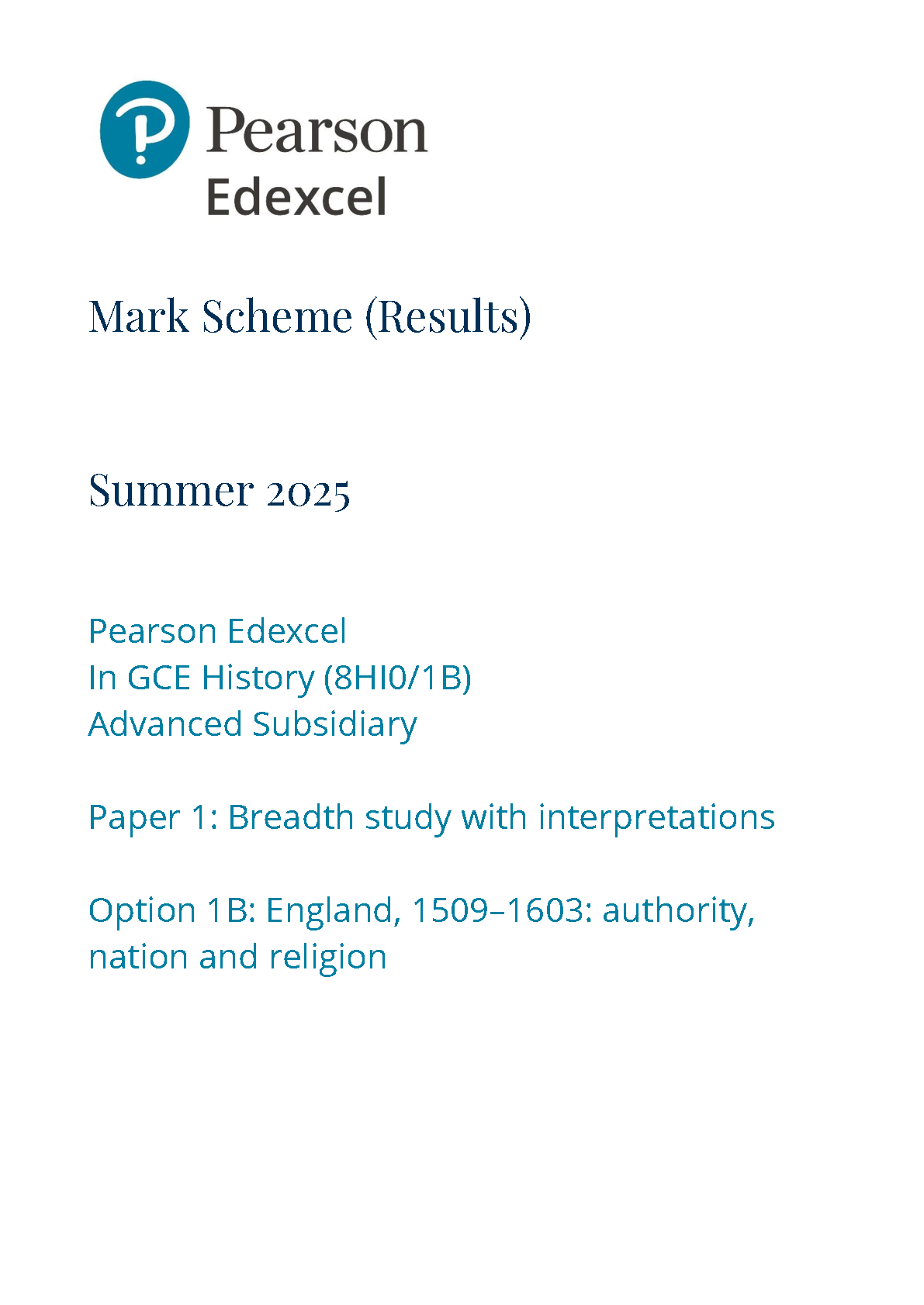 2025 Pearson Edexcel AS Level History Mark Scheme Paper 1 (8HI0/1B: Breadth study with interpretations)