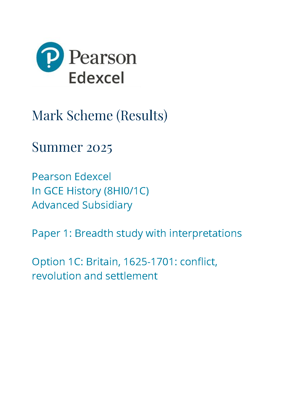 2025 Pearson Edexcel AS Level History Mark Scheme Paper 1 (8HI0/1C: Breadth study with interpretations)