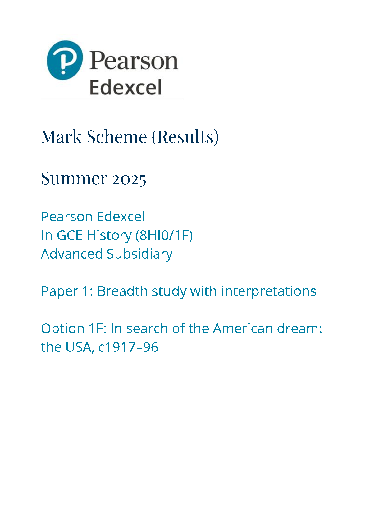 2025 Pearson Edexcel AS Level History Mark Scheme Paper 1 (8HI0/1F: Breadth study with interpretations)