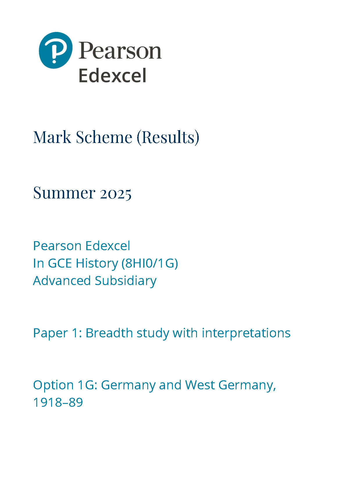 2025 Pearson Edexcel AS Level History Mark Scheme Paper 1 (8HI0/1G: Breadth study with interpretations)