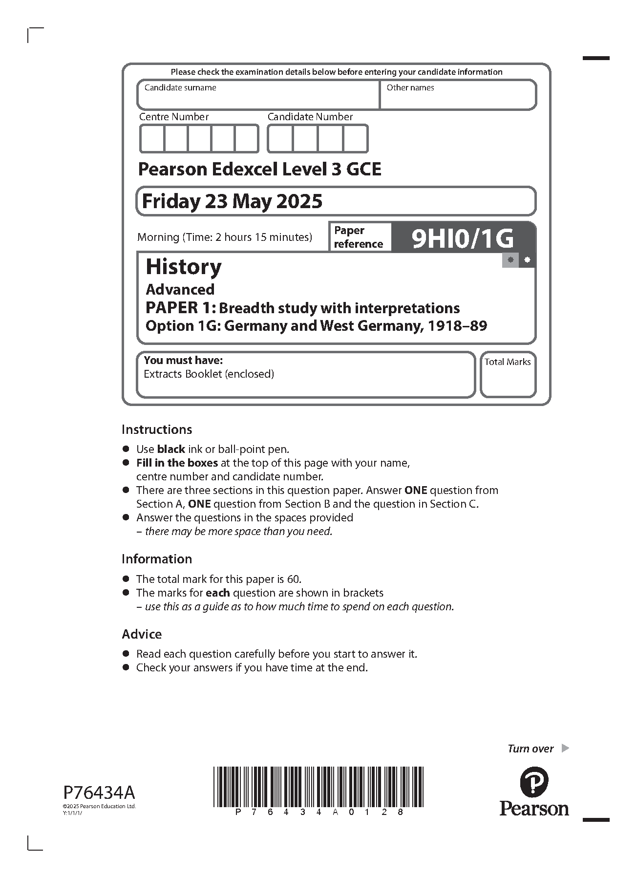 2025 Pearson Edexcel A Level History Paper 1 (9HI0/1G: Breadth study with interpretations)