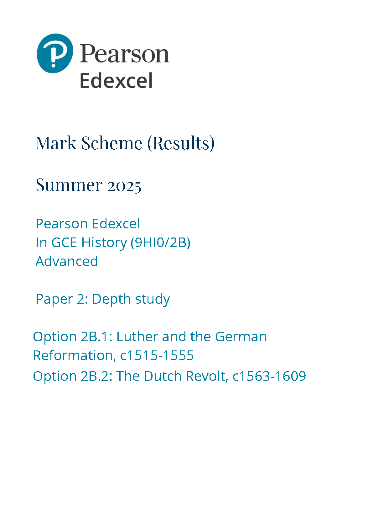 2025 Pearson Edexcel A Level History Mark Scheme Paper 2 (9HI0/2B: Depth study)