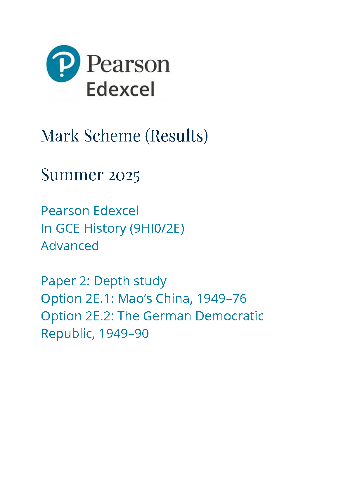 2025 Pearson Edexcel A Level History Mark Scheme Paper 2 (9HI0/2E: Depth study)