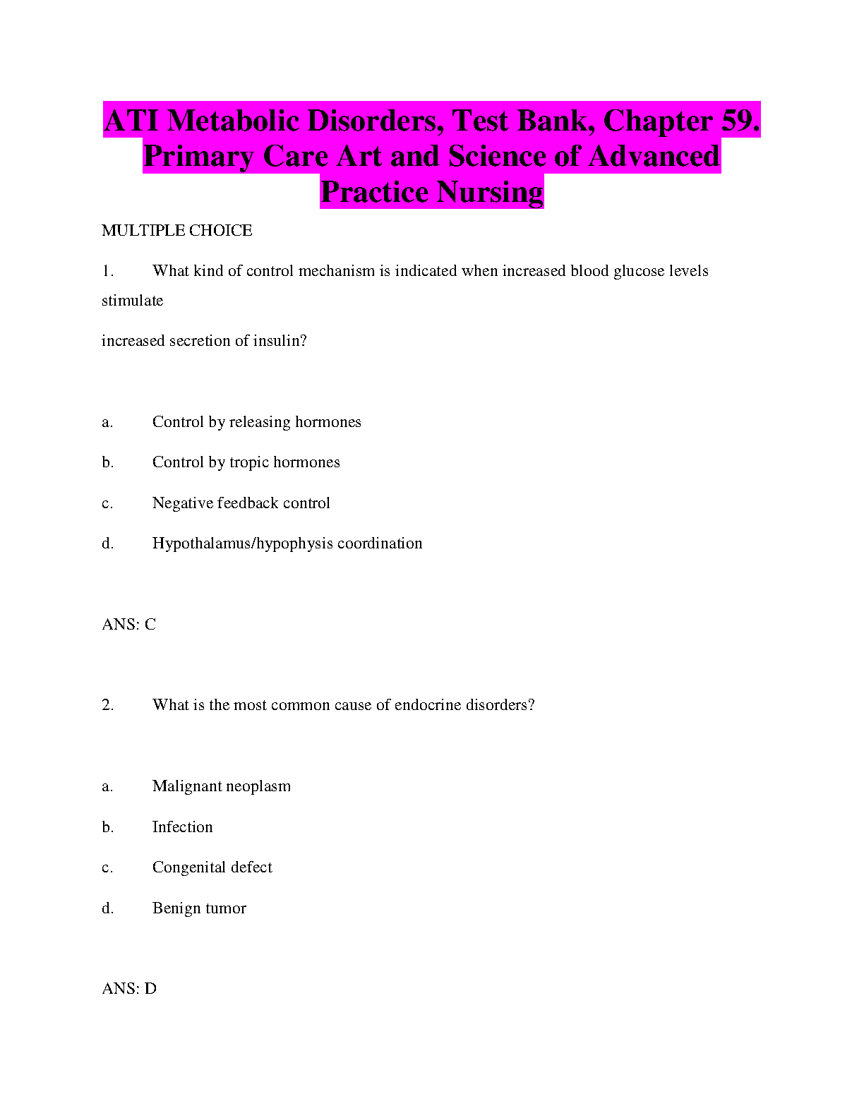 TEST BANK FOR ATI Metabolic Disorders, Chapter 59. Primary Care Art and Science of Advanced Practice Nursing