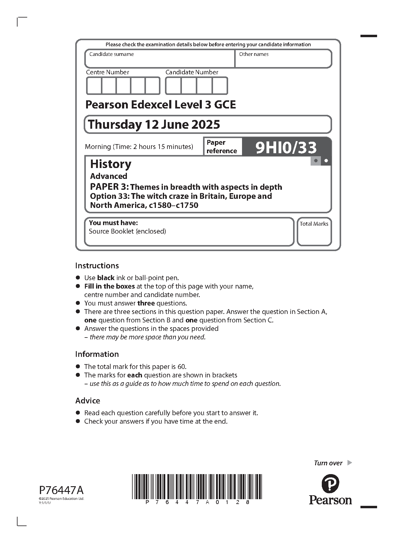 2025 Pearson Edexcel A Level History Paper 3 (9HI0/33: Themes in breadth with aspects in depth)