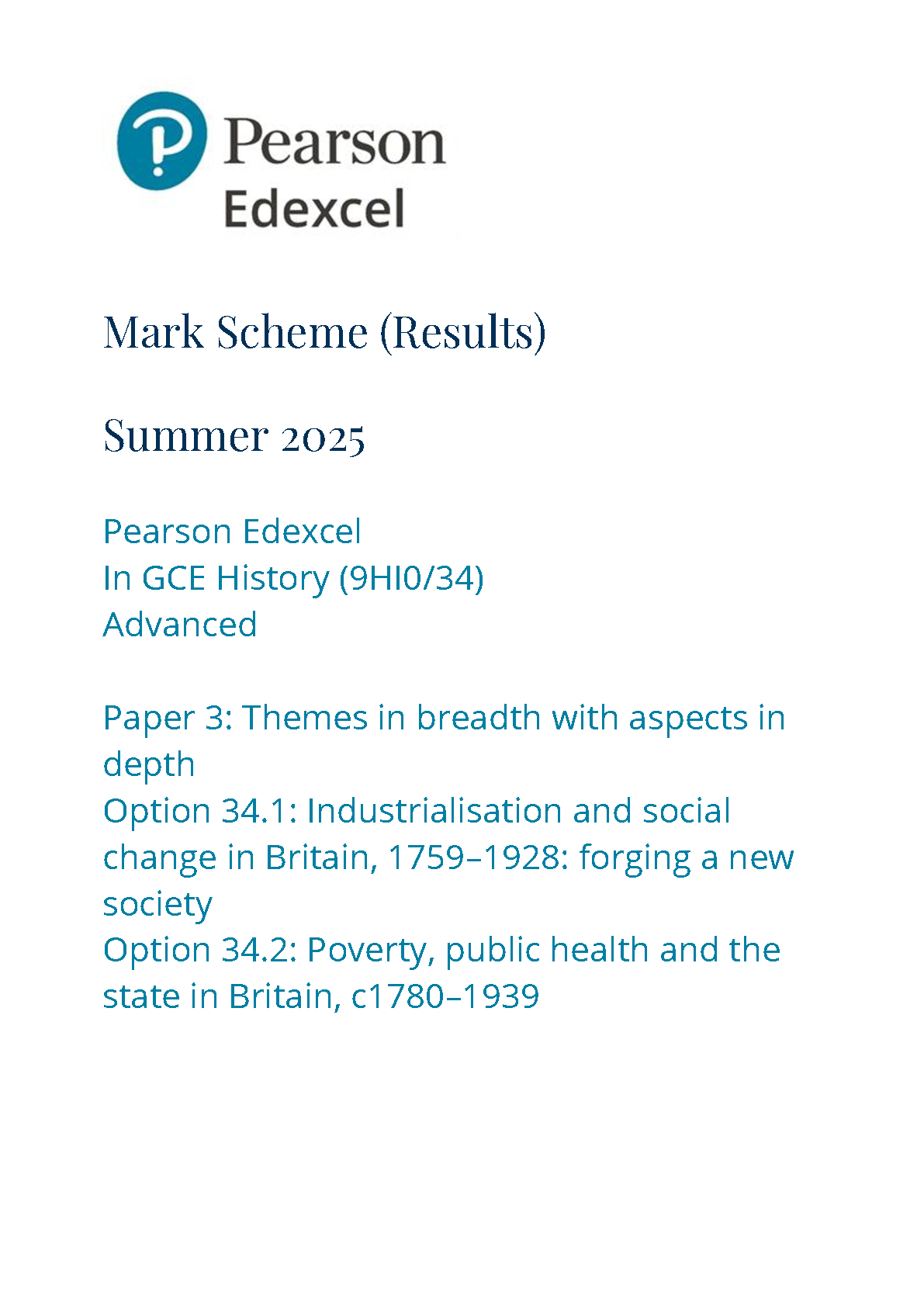 2025 Pearson Edexcel A Level History Mark Scheme Paper 3 (9HI0/34: Themes in breadth with aspects in depth)